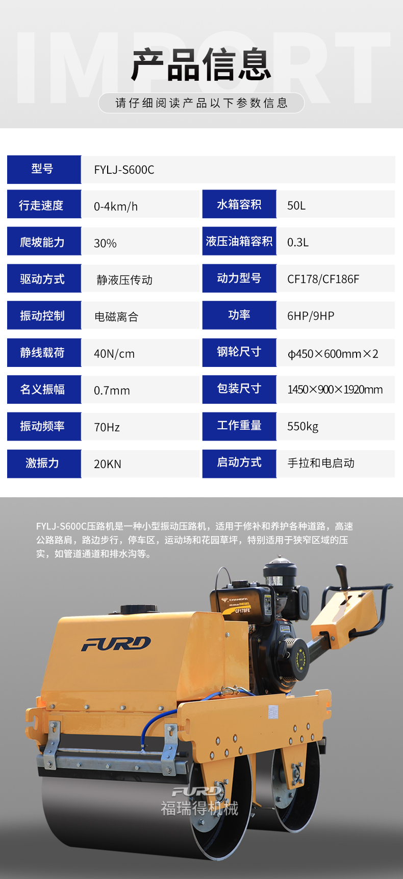 FYLJ-S600C 靜液壓小型手扶雙輪壓路機(jī)