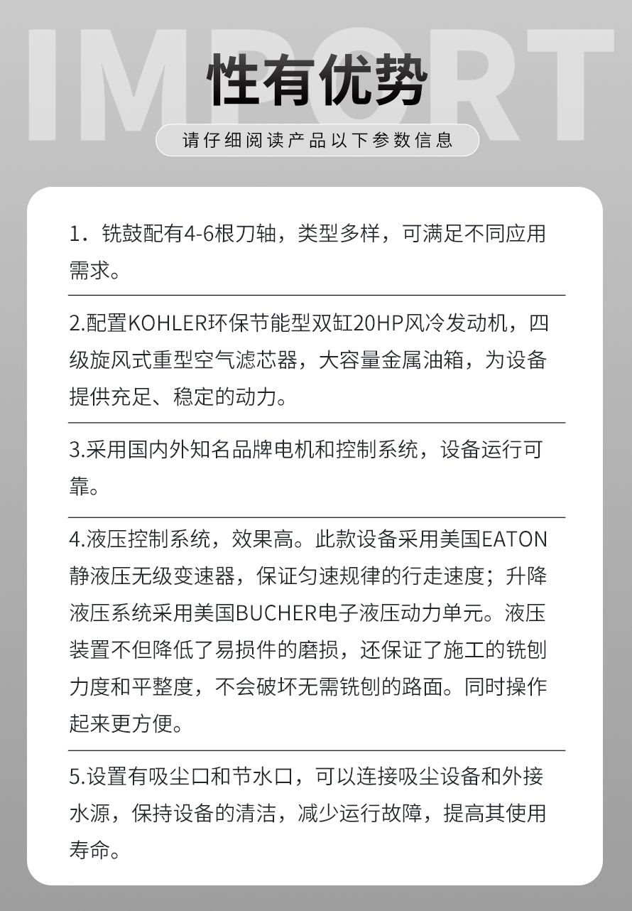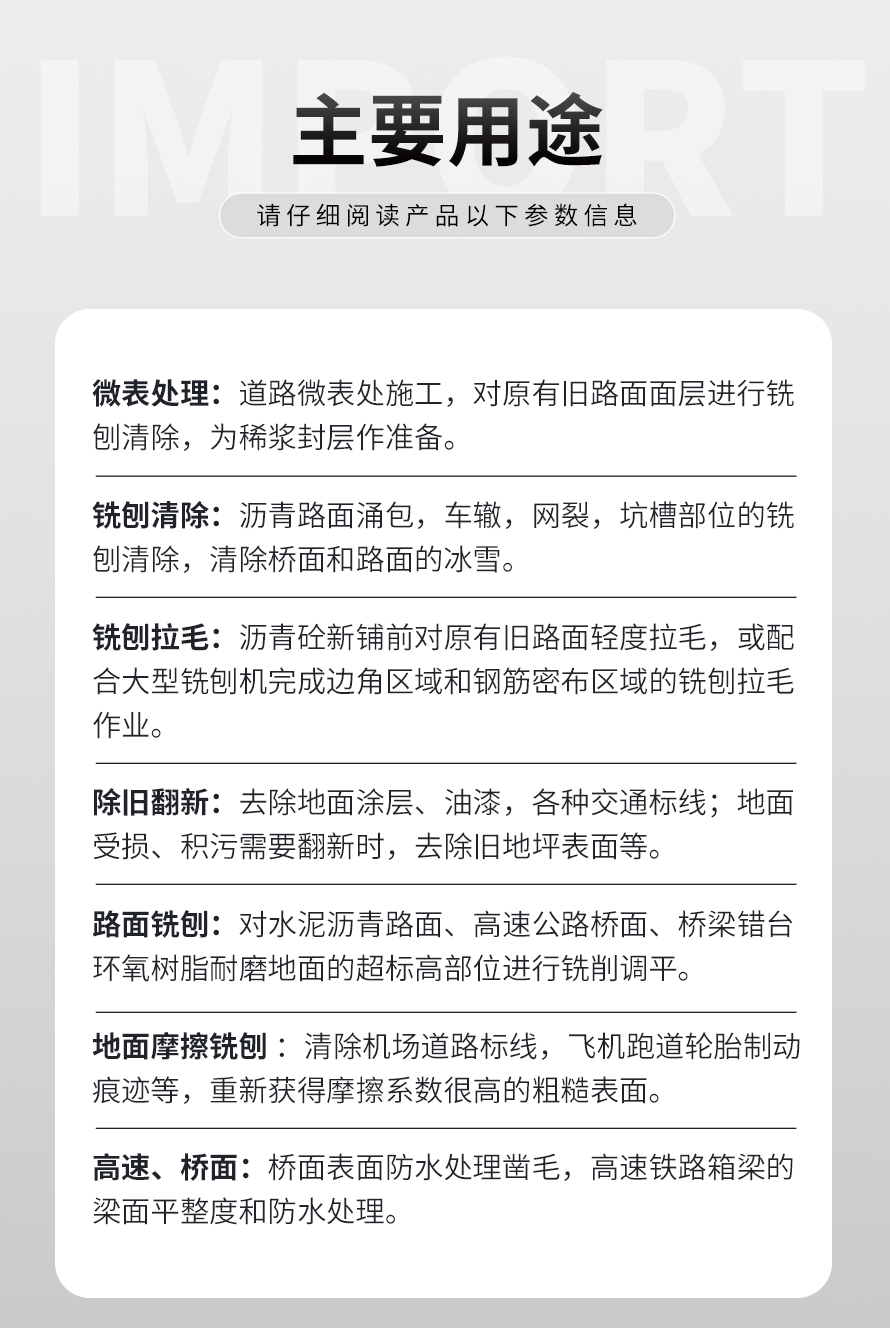液壓銑刨機(jī)結(jié)構(gòu)緊湊,布局合理,具有控制精度高、性能穩(wěn)定、操作簡單、維護(hù)保養(yǎng)方便等優(yōu)勢。其適合各種強(qiáng)度較高的混凝土瀝青等高出部分的去除工作,是其它類型的銑刨機(jī)無法替代的產(chǎn)品。