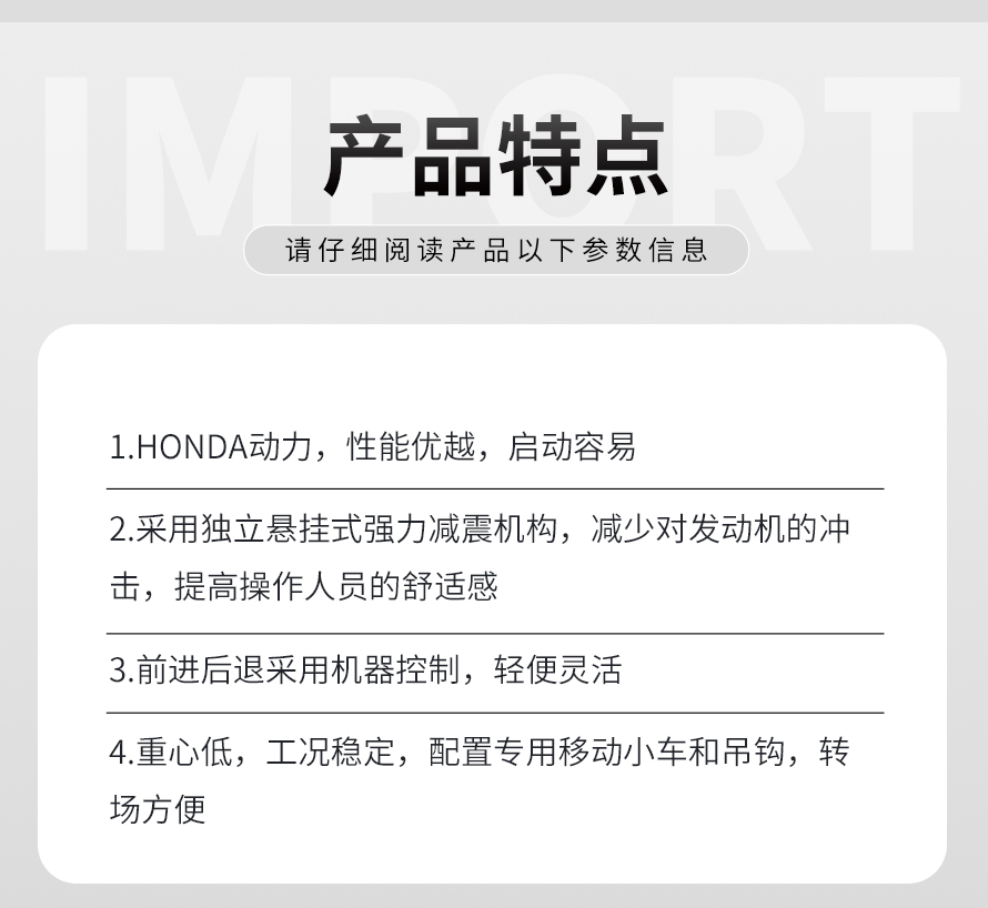 適用于路基邊緣、橋涵、管道、溝槽底部等狹長(zhǎng)地帶的壓實(shí)。 本田汽油動(dòng)力,名牌品質(zhì)保證。